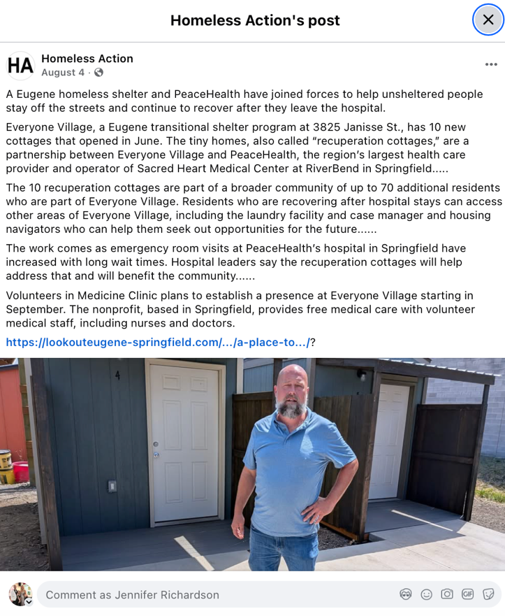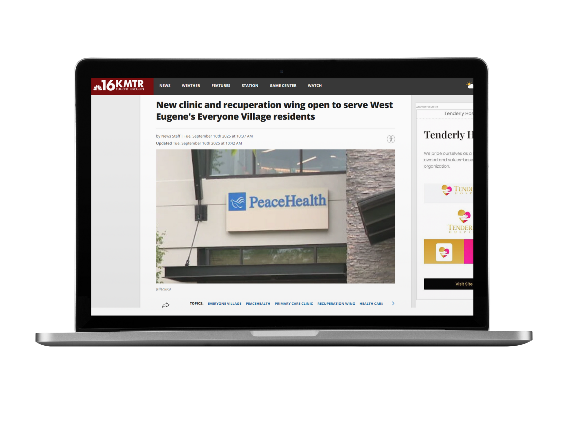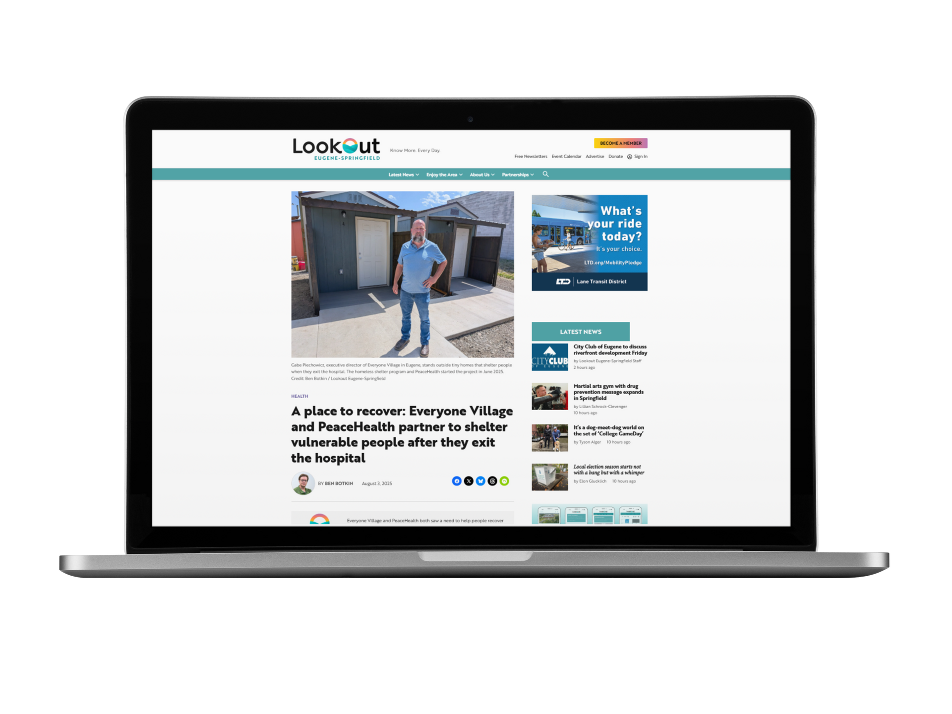 - “A place to recover: Everyone Village and PeaceHealth partner to shelter vulnerable people after they exit the hospital" Lookout Eugene-Springfield