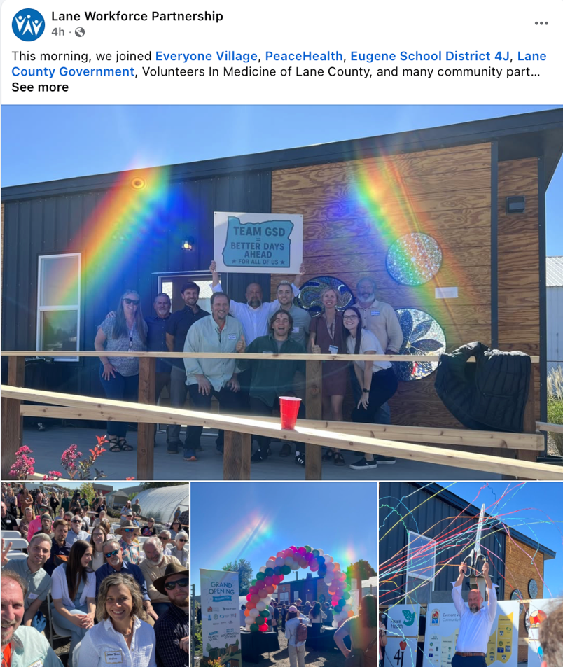 - “This morning, we joined Everyone Village, PeaceHealth, Eugene School District 4J, Lane County Government, Volunteers In Medicine of Lane County, and many community partners..." Lane Workforce Partnership