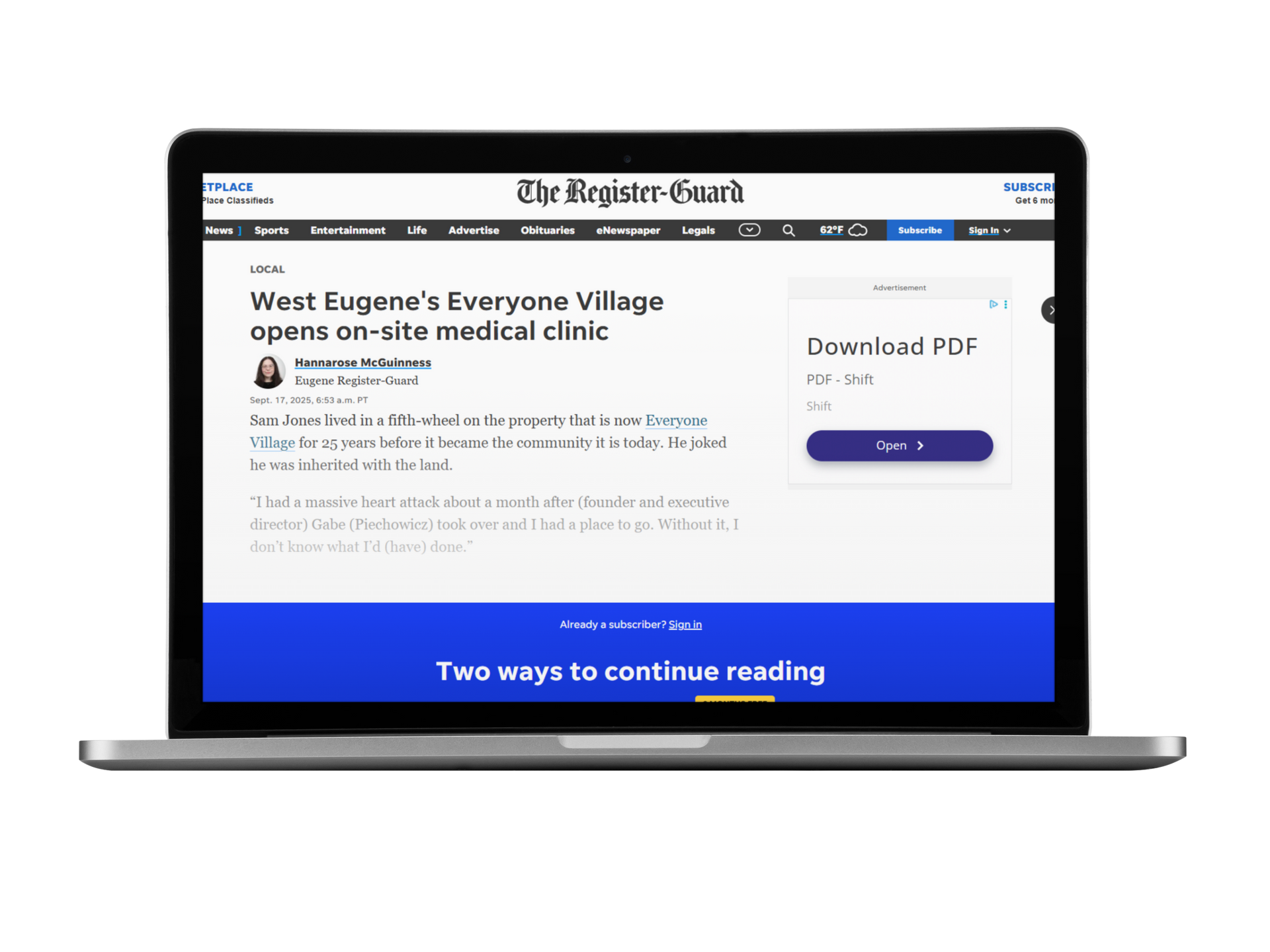 - “West Eugene’s Everyone Village opens on-site medical clinic” The Register-Guard